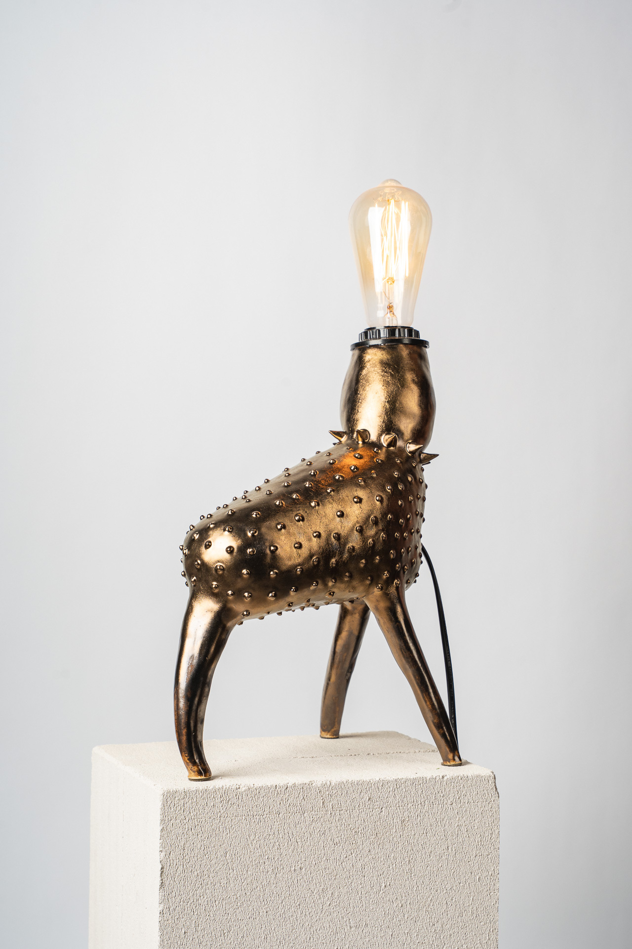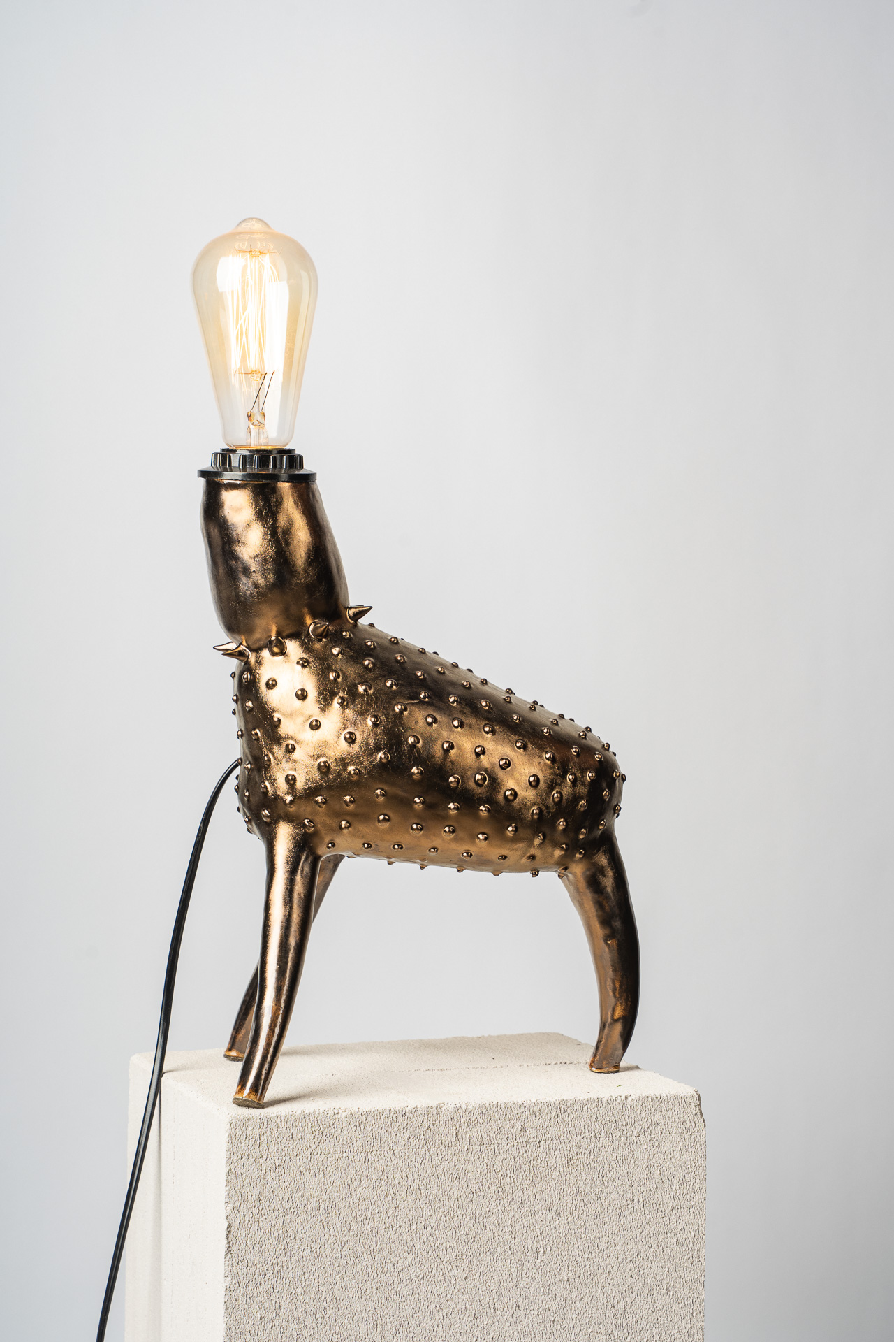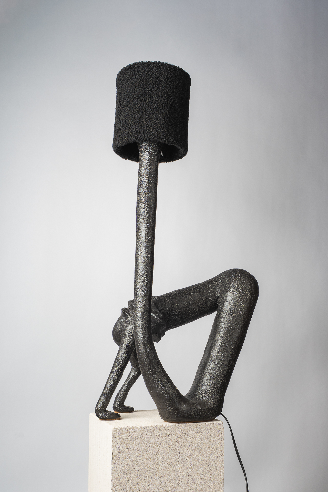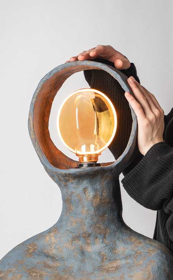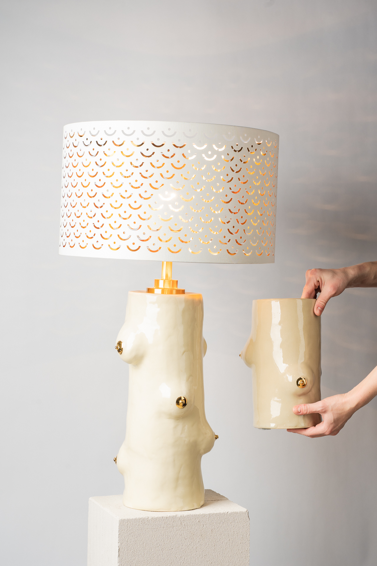 В этой работе я обращаюсь к теме телесности как первоисточника тепла. Основание светильника напоминает фрагмент человеческого тела — мягкого, округлого, живого. Небольшие выпуклые формы на поверхности читаются как груди, однако не копируют анатомию буквально, а становятсяпластическими метками женского начала, энергией той самой поддерживающей силы, которую в искусстве всегда связывали с материнством, телесностью и природной заботой. Золотые соски — это не украшение, а жест уравнивания тела и драгоценности. Здесь я поднимаю тему ценности: что именно в нашем теле считается достойным внимания, уважения, сохранения? Золото фиксирует то, что обычно скрыто, переводит интимное в статус значимого. Светильник не стремится к провокации. Его задача — показать тело как источник света. Когда абажур начинает светиться, поверхность основания оживает: теплые блики скользят по округлым формам, превращая их в часть самого светового потока. Тело становится медиатором света — тем, что рождает и передаёт тепло дальше. Работа балансирует между объектным дизайном, скульптурой и телесной метафорой, создавая ощущение интимности, мягкости и одновременно силы.