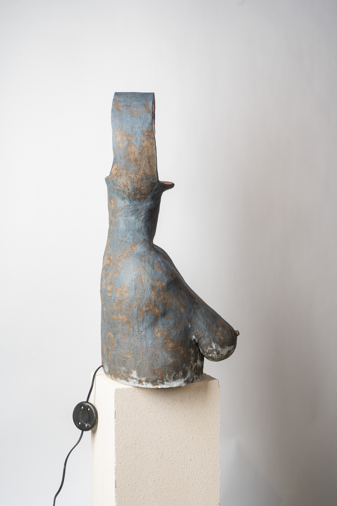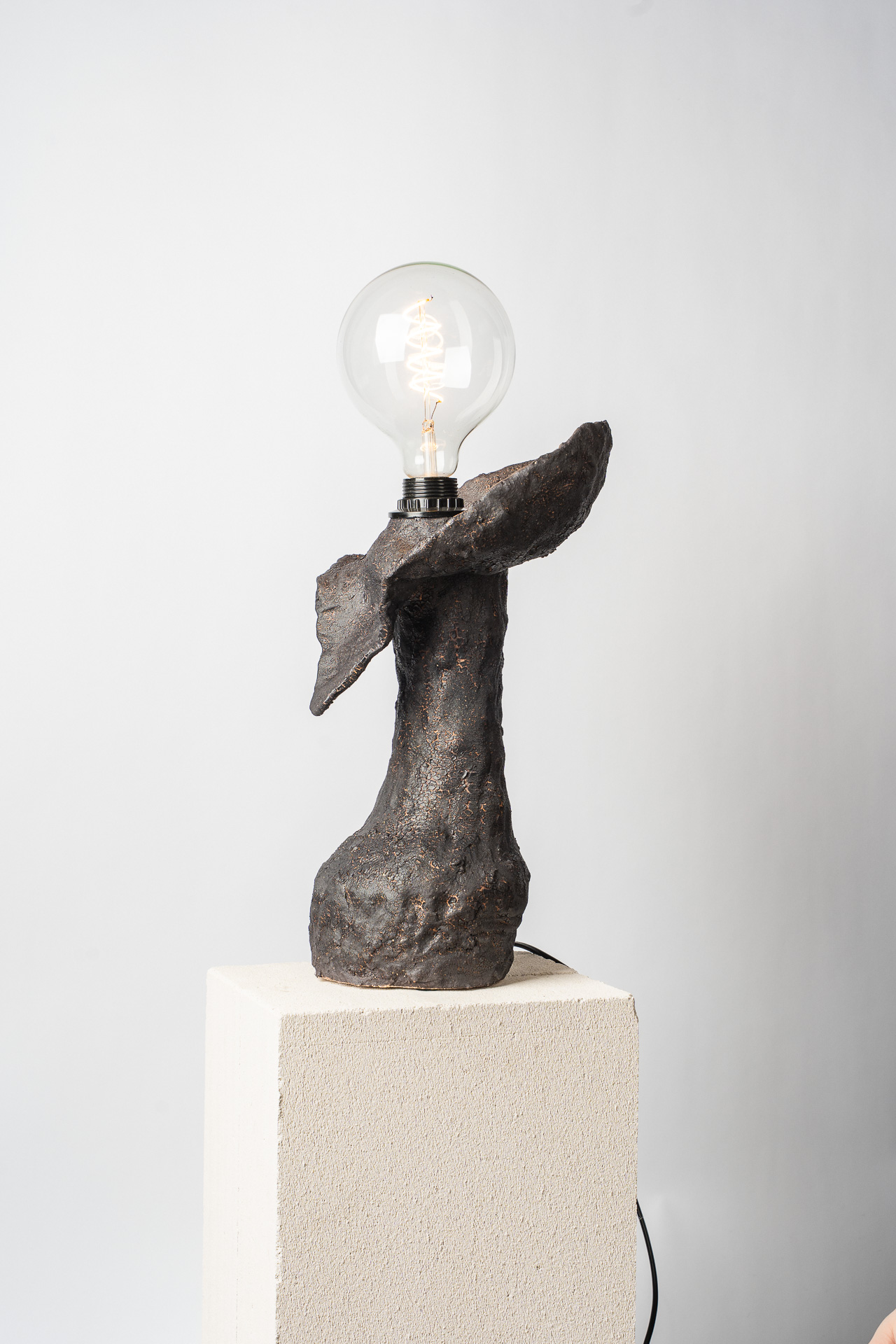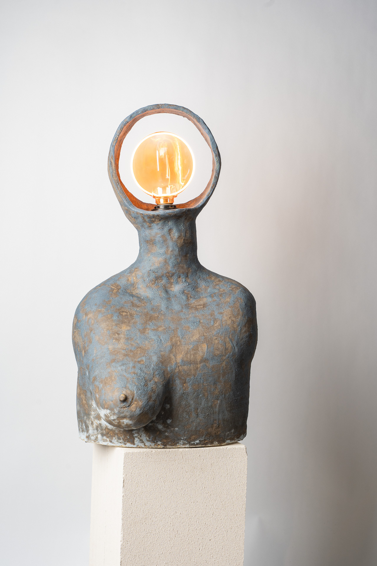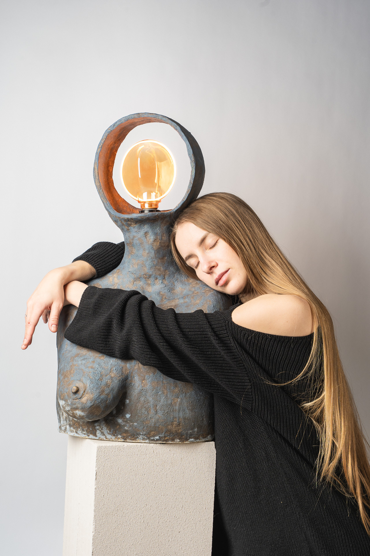 Это тело — как сосуд прожитого. В нём нет стремления к симметрии или совершенству — только тишина принятия. Одна грудь остаётся знаком того, что красота может быть неполной, не совершенной, но истинной. Свет внутри — не просто лампа, а дыхание. Он живёт в глине, как память о движении, о тепле рук, о присутствии. «Плоть и свет» — о хрупком равновесии между материальным и духовным, между формой и тем, что невозможно сформовать, о балансе между телом и тем, что живет внутри него. Когда-то, еще в детстве, я увидела у одной женщины неидеальность, спрятанную в мягких складках домашнего халата — след прожитой боли, которую она несла спокойно и буднично. Одна грудь была отрезана. И с тех пор во мне живёт это чувство: плоть бывает разной и далеко не идеальной