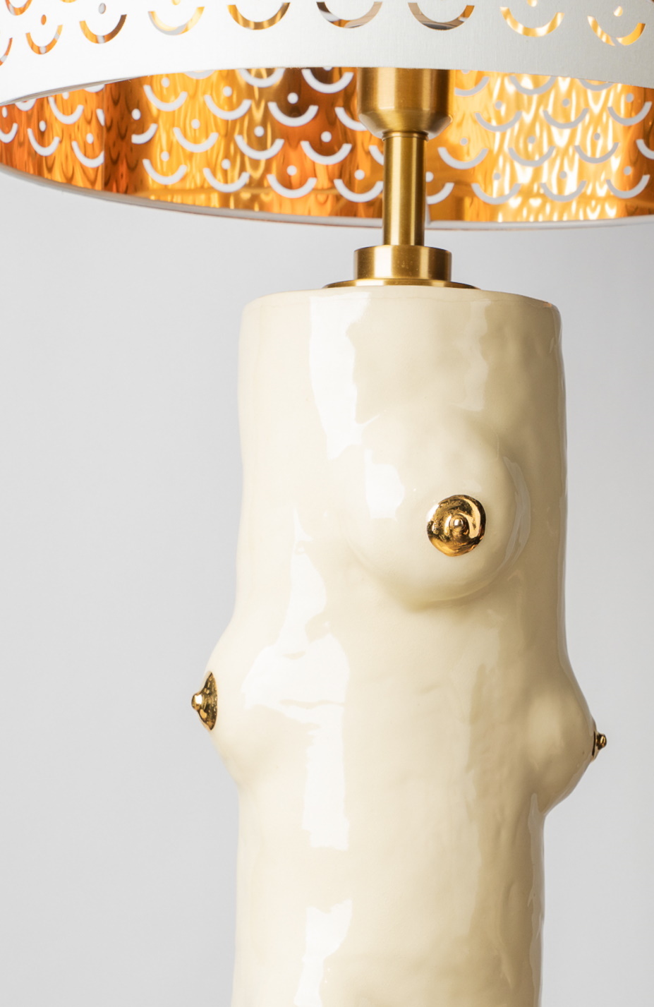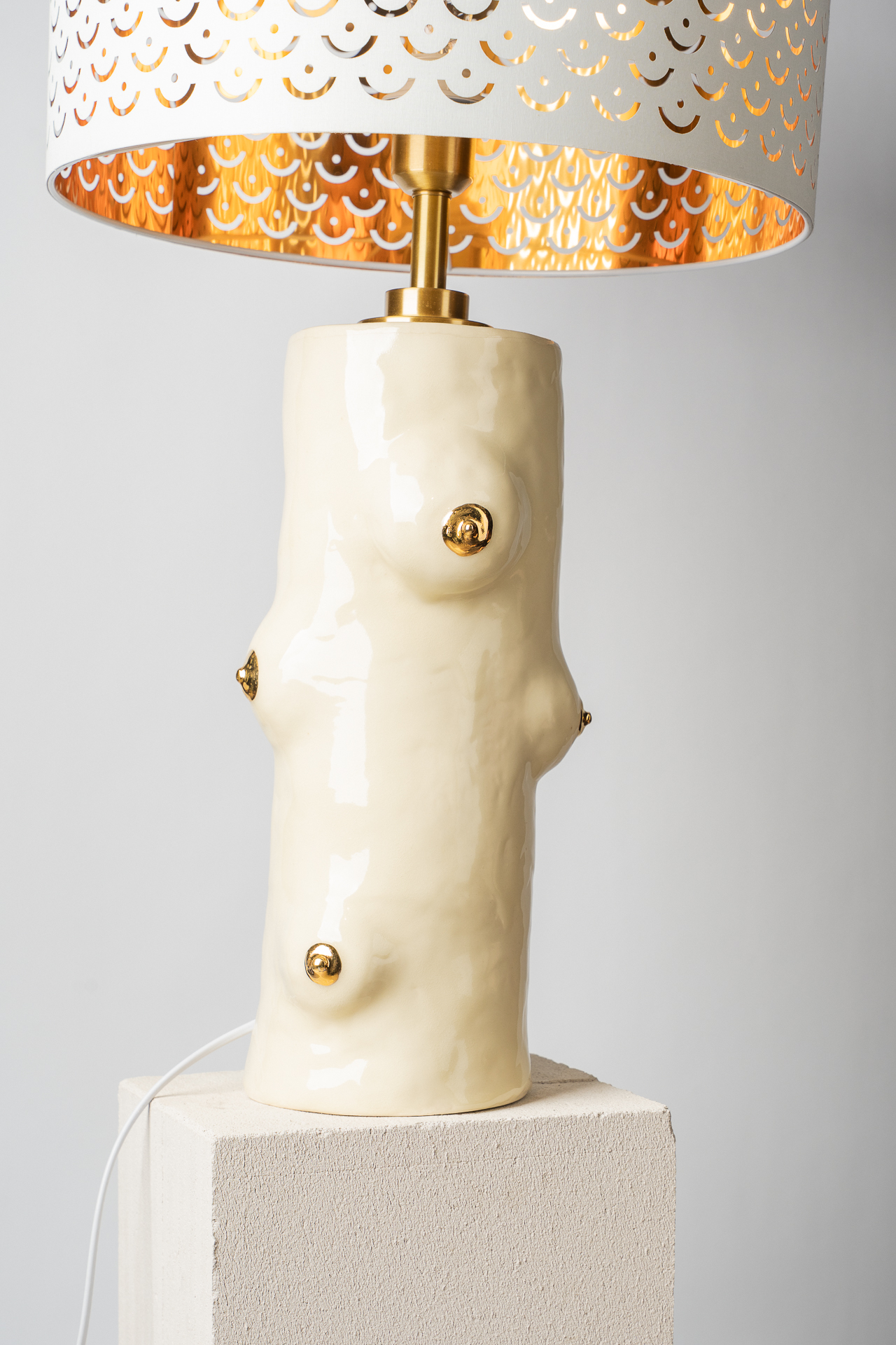 Авторский керамический светильник с пластическими формами груди и золотыми акцентами. Ручная лепка, уникальный объект, объединяющий телесность, тепло и современную эстетику. Даёт мягкий рассеянный свет и становится выразительным арт-элементом интерьера.
